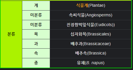 무/배추/유채 이런것들이 다 배추과에 속해서 유채밭에 들어가면 무나 배추향이 찐하게 납니다.