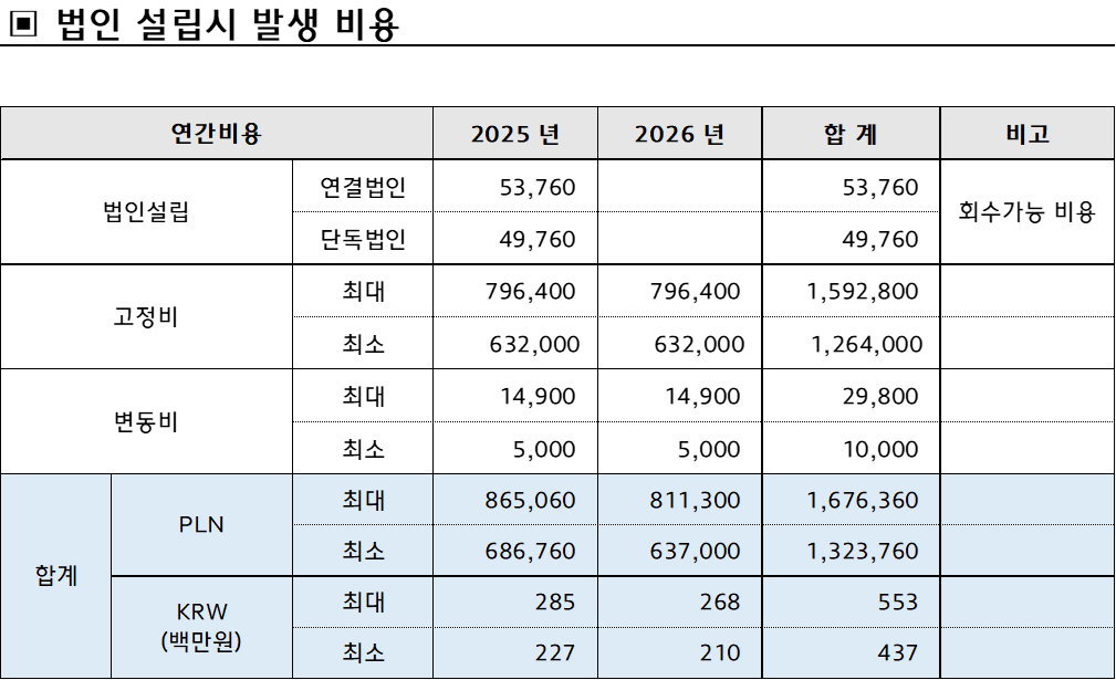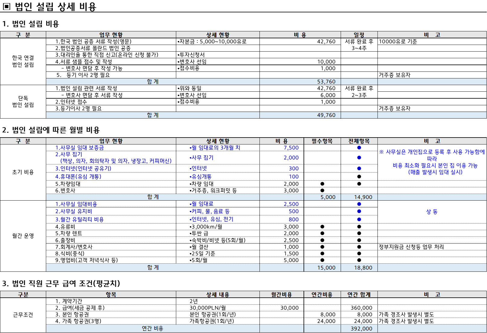 단독법인은 한국사람이 폴란드에서 법인을 세웠을때 발생하는 비용입니다.